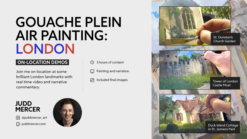 Cheerio, friends! Enjoy these three real-time, on-location plein air painting demos featuring some iconic London landmarks. Each video includes video and audio commentary to explain the process of how to interpret and capture unfamiliar scenes quickly with gouache.