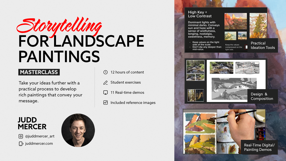 Judd Mercer is a contemporary landscape painter and Colorado native obsessed with telling stories through light. Judd's teaching style is engaging, fast-paced, and packed full of practical tips to improve any painting practice.